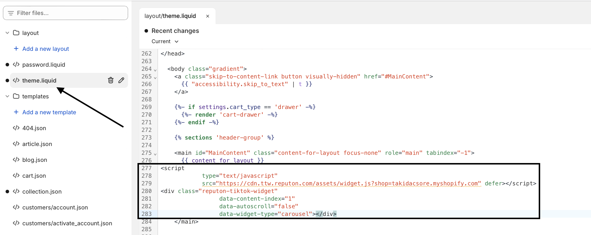 For example, to add the widget to every page under the main content, insert the code into the theme.liquid file within the main block, directly below {{ content_for_layout }}.
