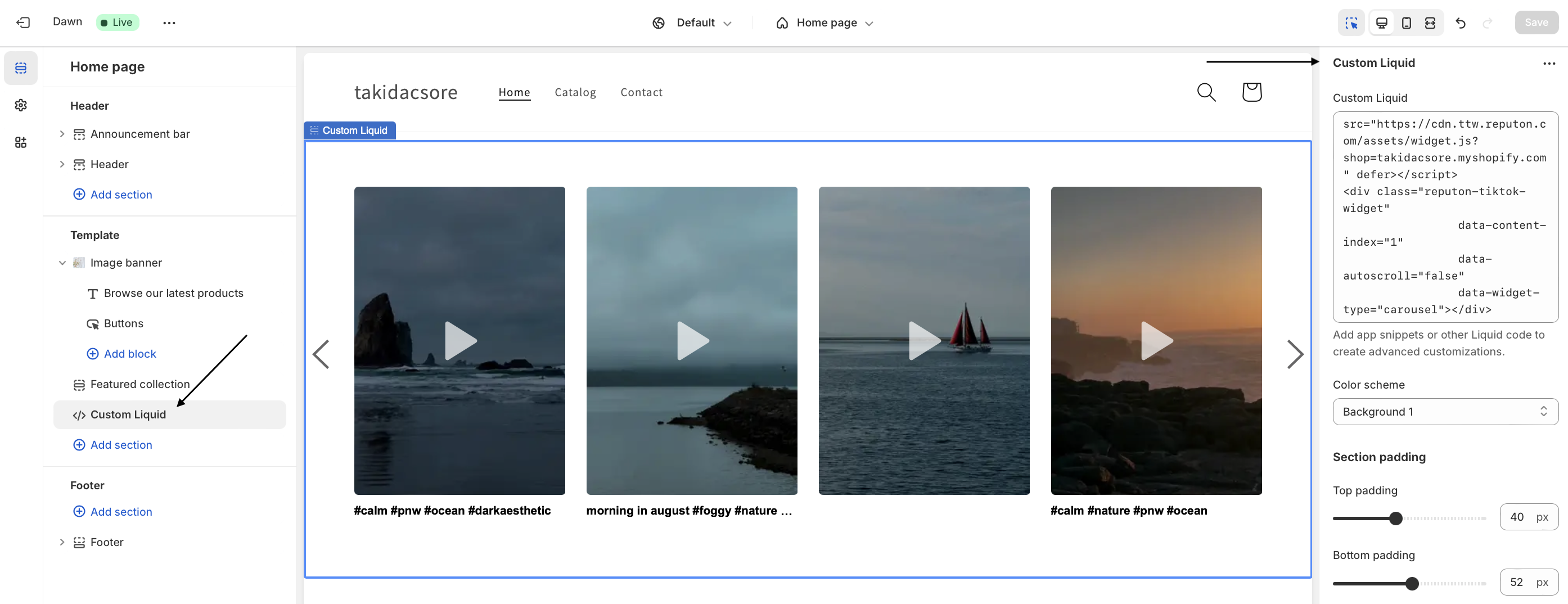 Go to Theme Customization and select Custom Liquid from the list. Add the code and click save.